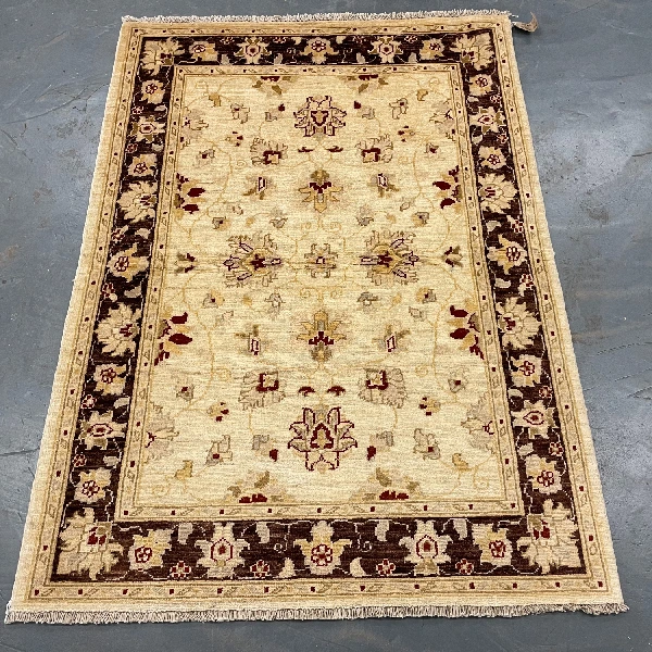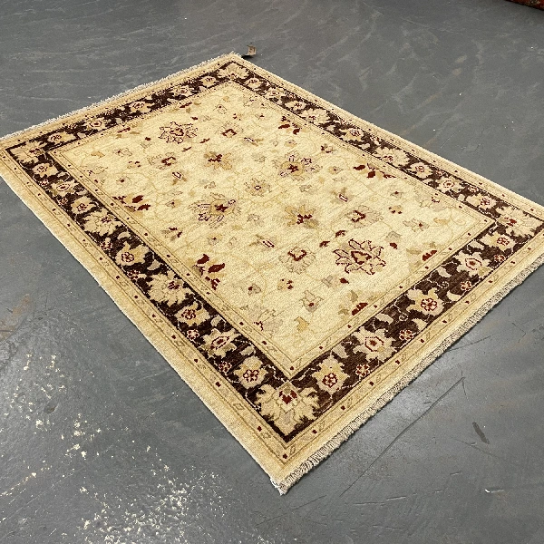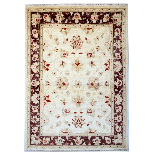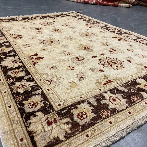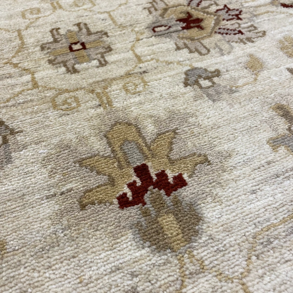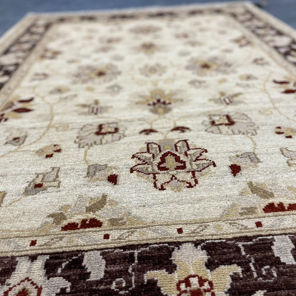 Hand-knotted by skilled artisans, this rug is made from 100% premium wool on a sturdy cotton foundation, ensuring durability and a soft underfoot feel. The use of natural dyes enhances the richness of its neutral cream and brown color palette, allowing it to blend seamlessly into various home decors. With its fine craftsmanship and intricate weaving, this rug is an investment in both style and quality.
