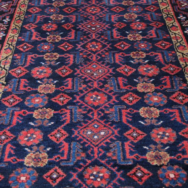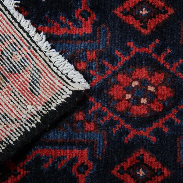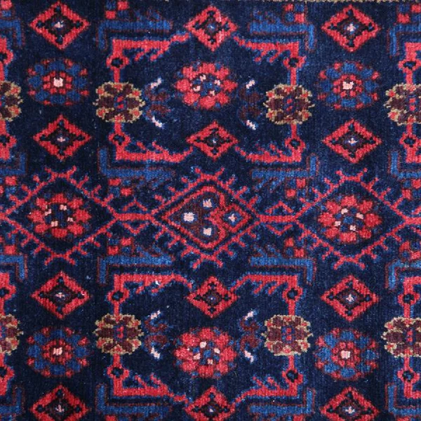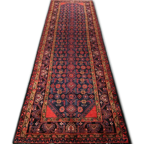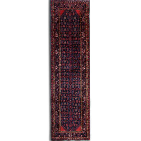 This Persian runner rug showcases an all-over repeat pattern, a signature of traditional Persian craftsmanship. The harmonious blend of deep blue and rich red tones enhances its rustic appeal, while geometric and floral motifs add depth and texture. Its long rectangle shape makes it an ideal accent for narrow spaces, offering both visual intrigue and functional elegance.