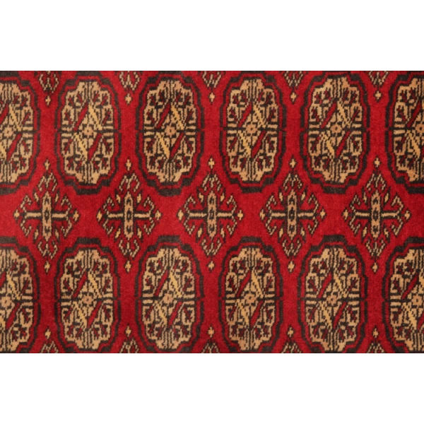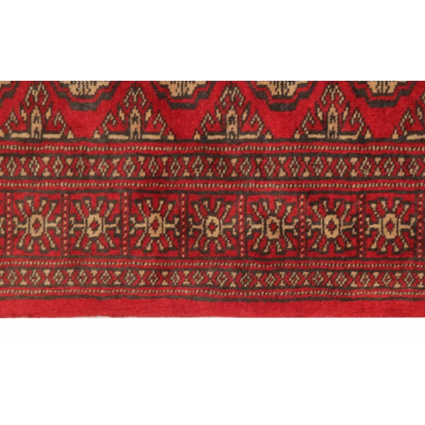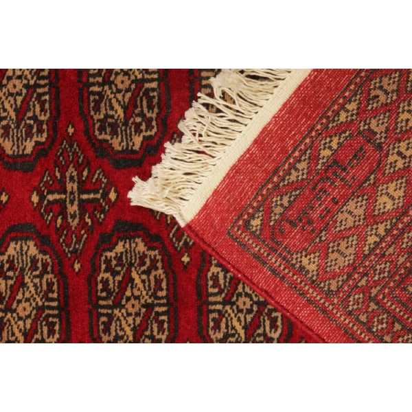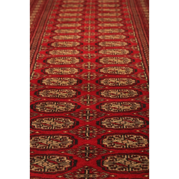 Hand-knotted by skilled Pakistani artisans, this rug is woven using high-quality wool on a sturdy cotton foundation. Each knot is meticulously tied, reflecting Turkmen weaving excellence. The use of natural dyes enhances its striking red and black tones, ensuring long-lasting beauty and durability. A true work of art, this vintage Bukhara runner is a testament to the craftsmanship and dedication of generations of weavers.