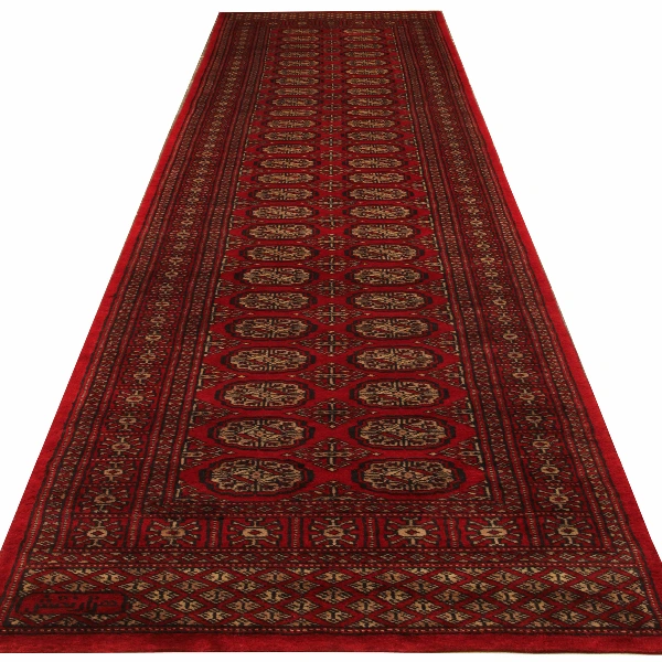 Featuring an all-over repeating medallion pattern, this Bukhara-style runner is a masterpiece of symmetry and precision. The rich red base is complemented by bold black geometric motifs, enhancing its tribal and oriental charm. Its rustic yet sophisticated aesthetic makes it a versatile addition to both traditional and contemporary spaces, adding depth and warmth to hallways, staircases, and entryways.