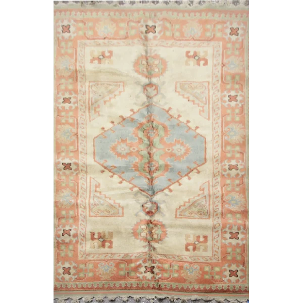 This rectangular Turkish rug showcases a distinct central medallion, surrounded by symmetrical, geometric motifs that create a bold and structured aesthetic. The warm terracotta and beige base, accented by deep blue details, gives it a balanced yet striking appearance. Perfect for traditional and contemporary settings, this rug enhances the ambiance of any living room, study, or hallway.