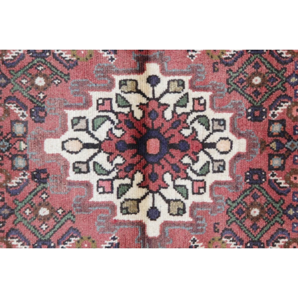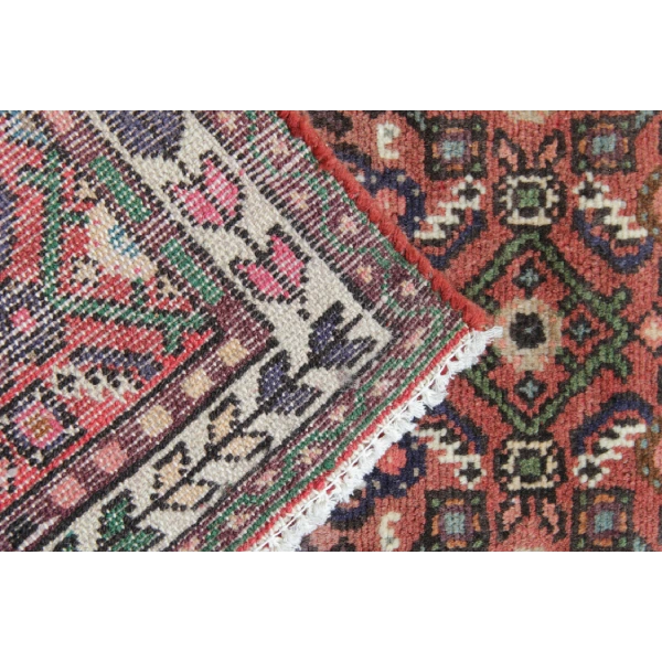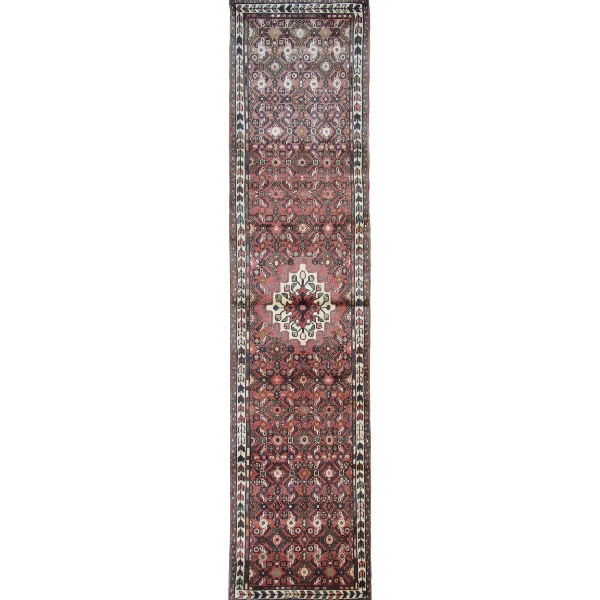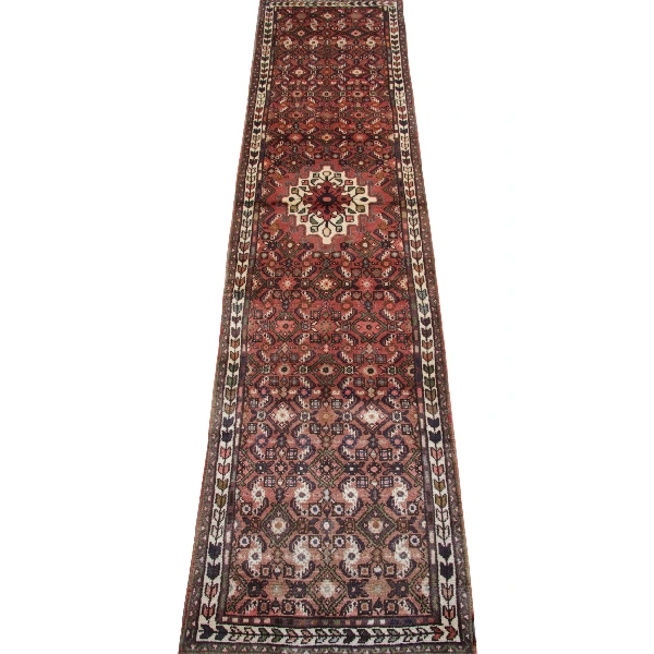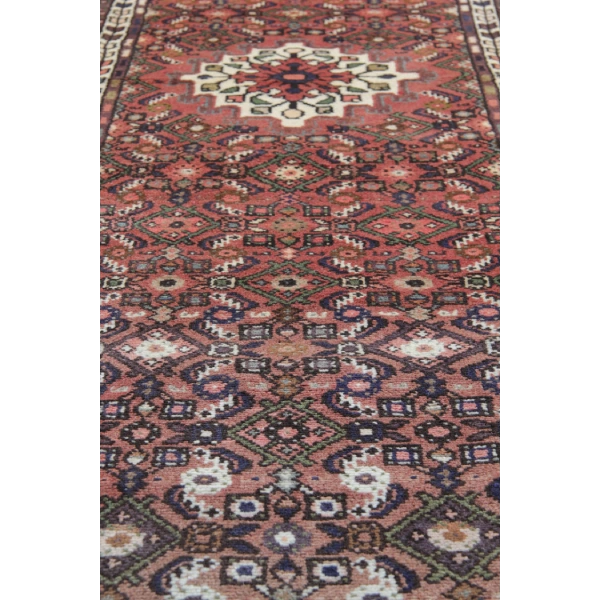 This traditional Persian runner features a striking central medallion, framed by a detailed Herati pattern that extends across the rug in a symmetrical layout. The terracotta rust background is beautifully complemented by soft cream and pink floral accents, creating a warm and inviting aesthetic. Its elongated form and intricate detailing make it a perfect choice for classic and modern interiors alike.
