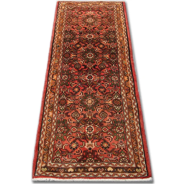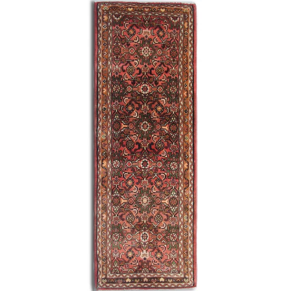 This Vintage Persian Hussein Abad Runner Rug is a timeless masterpiece, hand-knotted from premium wool and cotton. Boasting rich terracotta rust and pink hues, it features an intricate Herati pattern, a hallmark of Persian craftsmanship. Perfect for hallways, entryways, or narrow spaces, this 1950s vintage runner adds warmth, character, and an authentic touch of Persian tradition to your home decor.