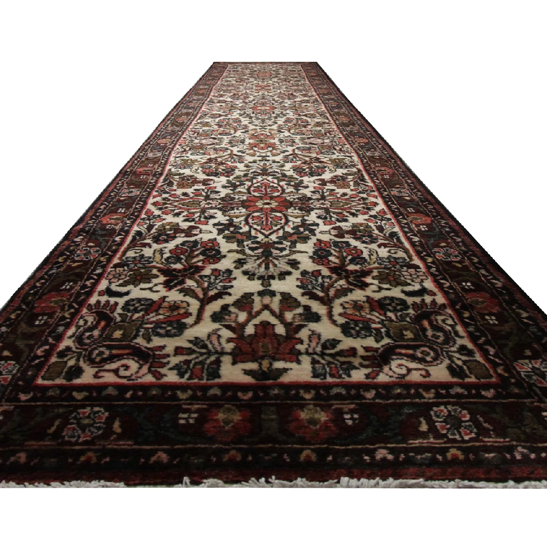 This long rectangular runner features a traditional Persian floral design, creating an elegant all-over pattern with rustic charm. The rich burgundy base is beautifully complemented by accents of brown and cream, delivering a harmonious color palette. Its elongated shape and medium size make it ideal for hallways or stairs, infusing any space with classic sophistication.