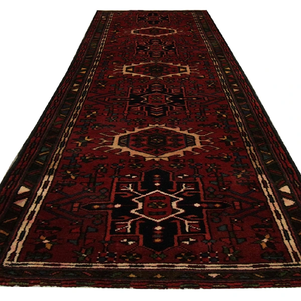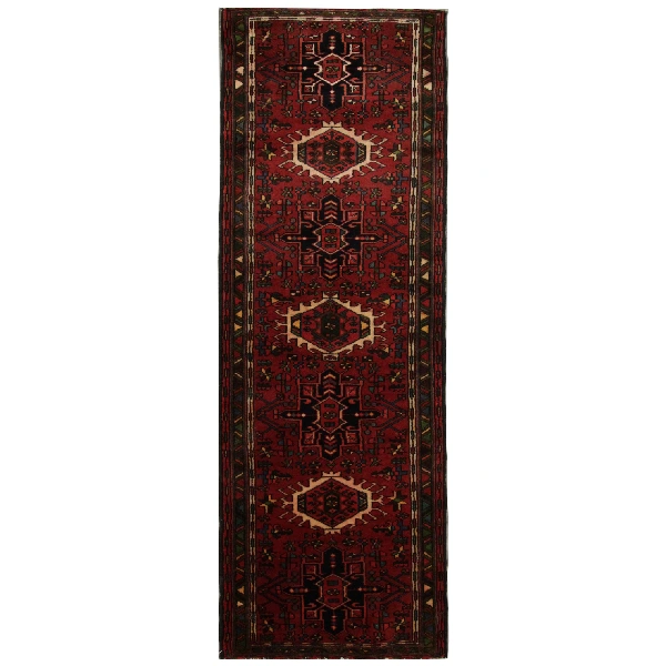This rug showcases a classic geometric design, with intricate symmetrical motifs that create a striking visual balance. The deep red and burgundy tones, accented by subtle rustic details, make it a versatile choice for both traditional and modern interiors. Its elongated runner shape is perfect for hallways, staircases, or entryways, adding depth and warmth to any space.